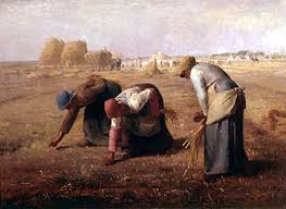 Esta pintura ,muestra el trabajo rural, pero haciendo hincapié en lo social. Tres campesinas ataviadas con la vestimenta típica normanda recogen inclinadas los restos de la cosecha, el trabajo más duro y menos reconocido entre las tareas rurales. Sus posturas reflejan la fatiga que provoca su labor. Los personajes se sitúan en primer plano elevándolos a la categoría de héroes y la iluminación infiere dramatismo a toda la escena.